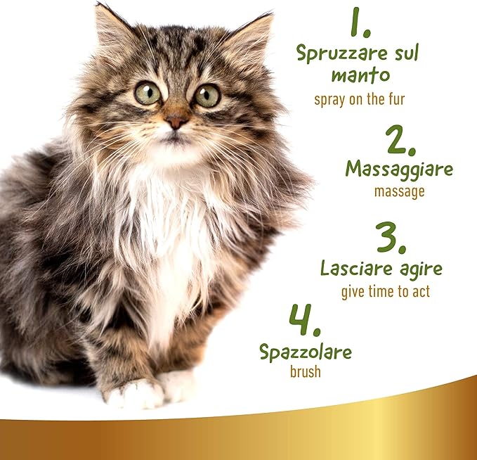 Spruzzare sul manto ed in particolare sui nodi, evitando occhi, naso e bocca; aumentare leggermente la quantità in caso di uso su pelo sporco, prima dello shampoo, o ridurla in caso di uso su pelo asciutto e pulito. Massaggiare delicatamente per ottenere una buona penetrazione del prodotto nei nodi più voluminosi. Lasciare agire per alcuni minuti. Non risciacquare, se non in caso di assoluta necessità. Spazzolare e pettinare fino ad ottenere il risultato desiderato.