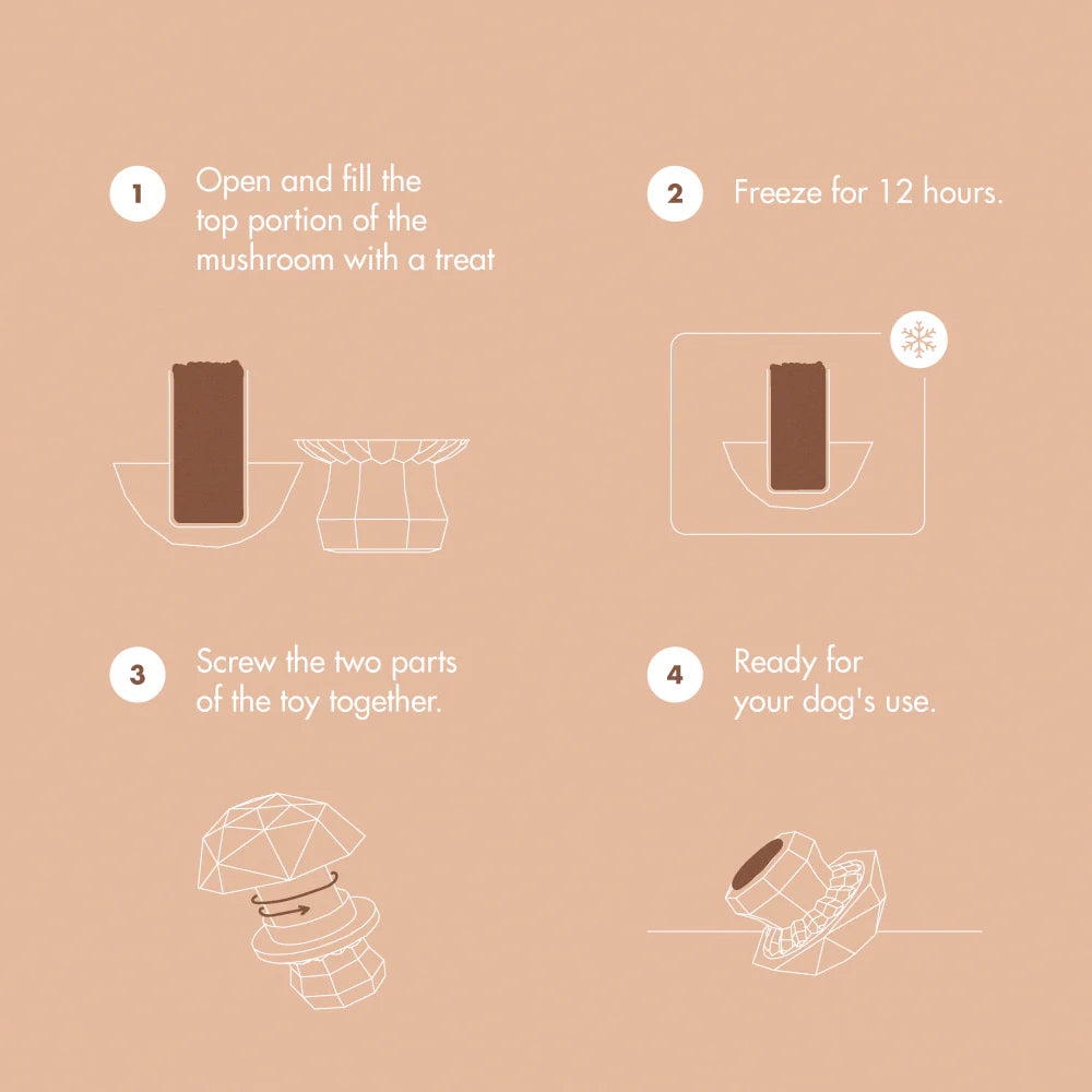 Il giocattolo per cani a forma di fungo è progettato per snack congelati senza sporcare. Parte della collezione SuperVeggiez, ha una parte superiore piatta per aggiungere snack umidi a base di burro di arachidi, yogurt o brodo. Congela il giocattolo per 12 ore ed è pronto per il tuo cane. Realizzato in gomma naturale resistente e atossica, è un ottimo modo per rinfrescare il tuo cane e prolungare il tempo di gioco. Ideale per i cani che amano leccare, masticare e rimanere coinvolti.