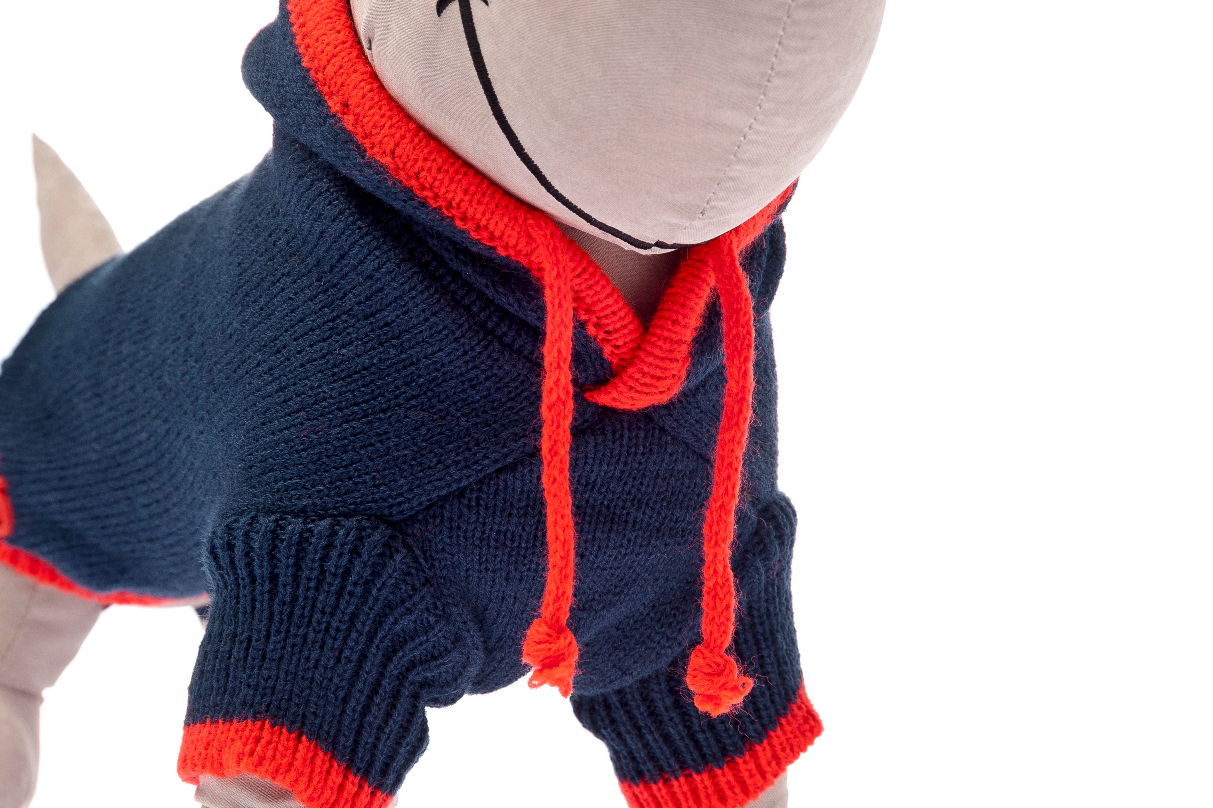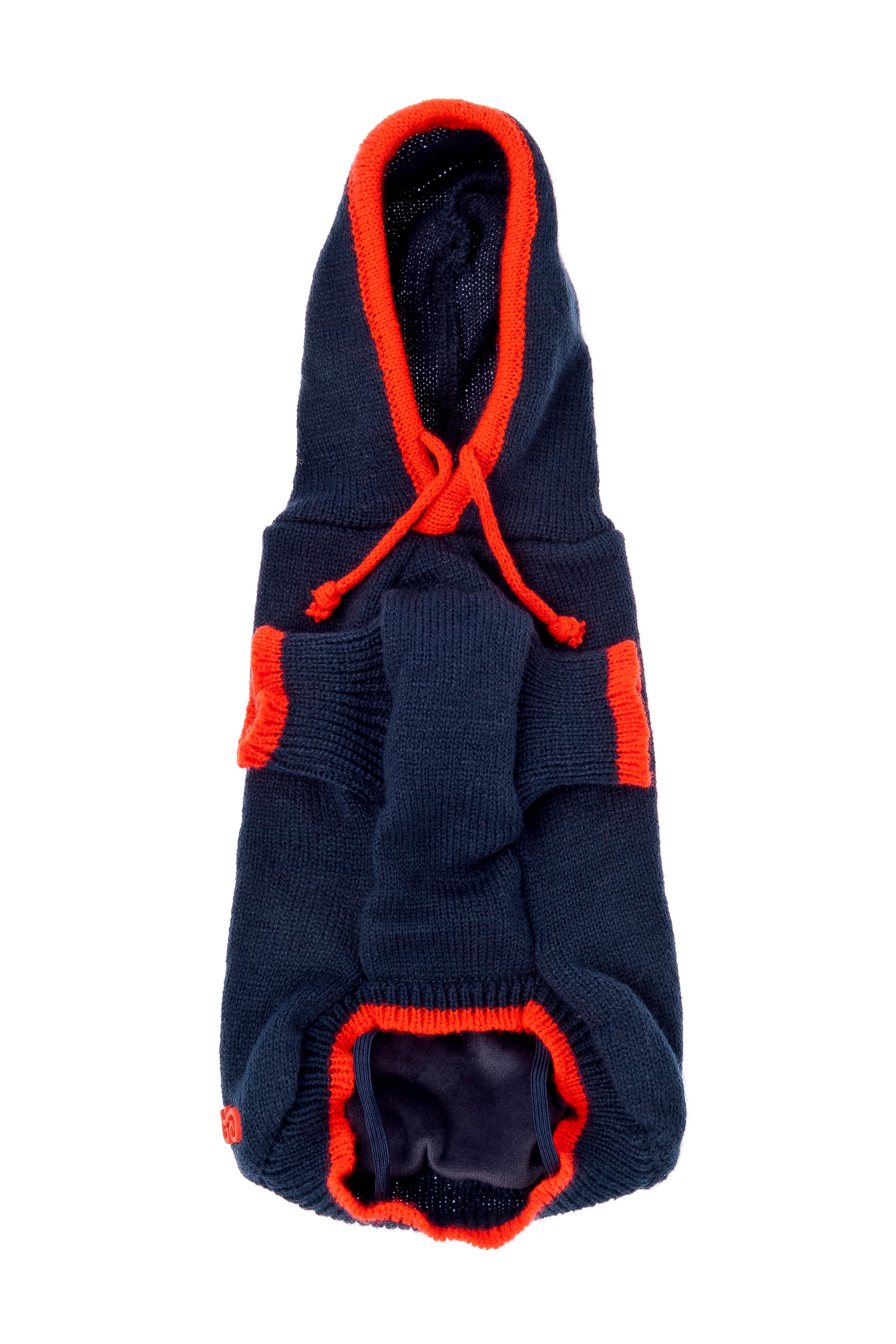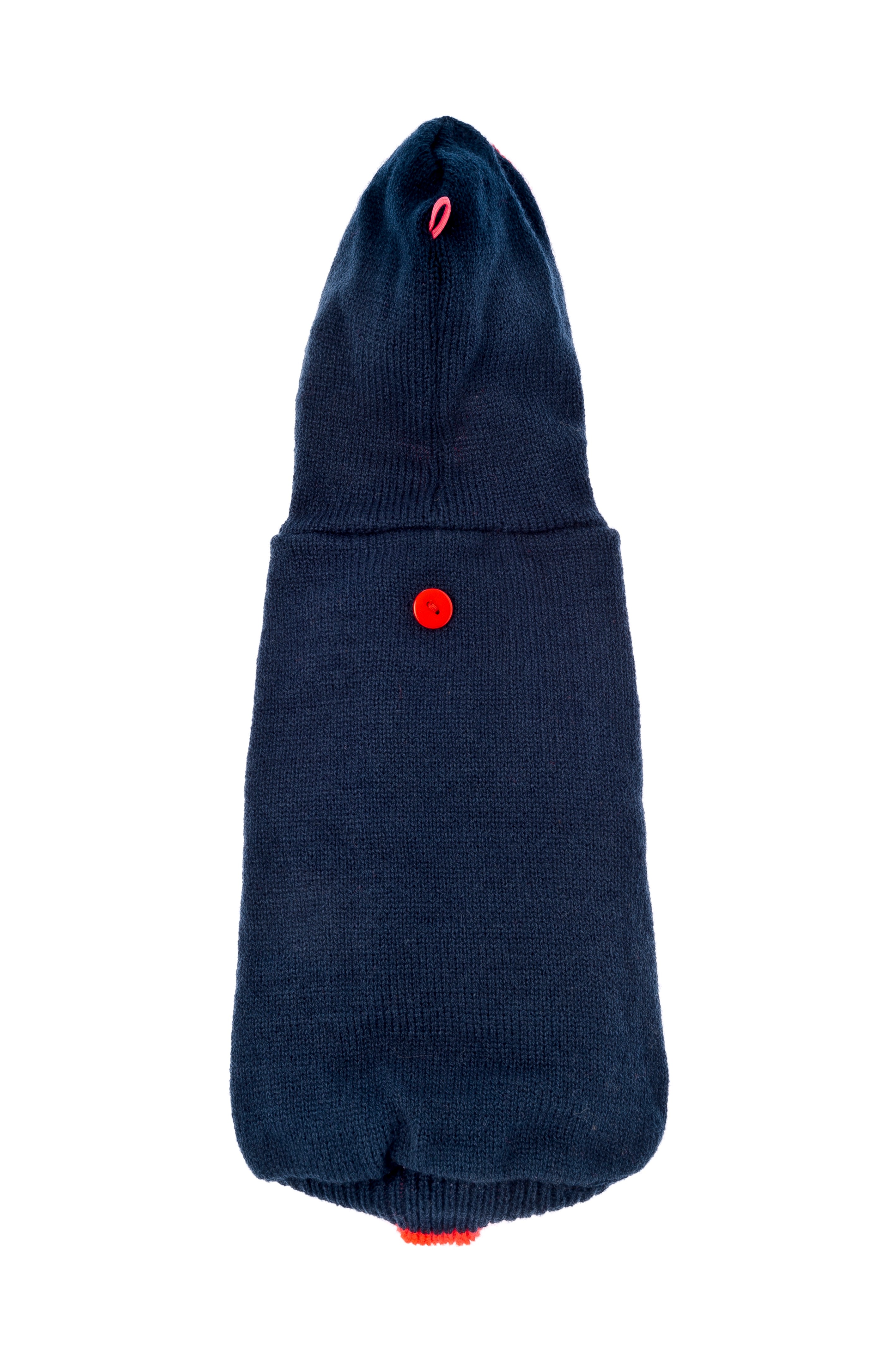 Morbido e caldo maglione con cappuccio e cordini , bottone per fissare il cappuccio, asola per collare , elastici porta zampe. Interno delicato e caldo Pile  per le giornate piu' fredde.