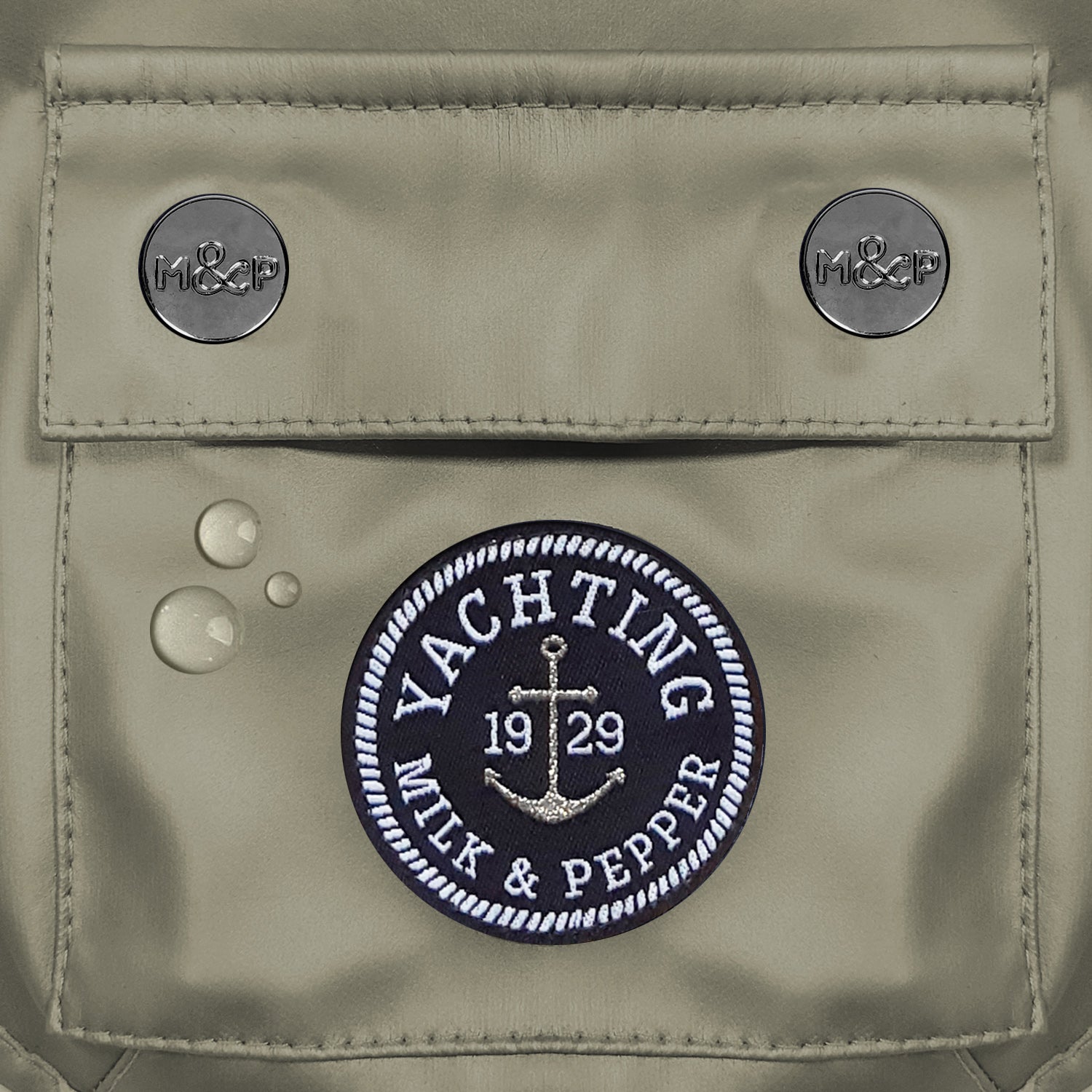 Tasca posteriore con bottoni a pressione e spilla in tessuto «Yachting».