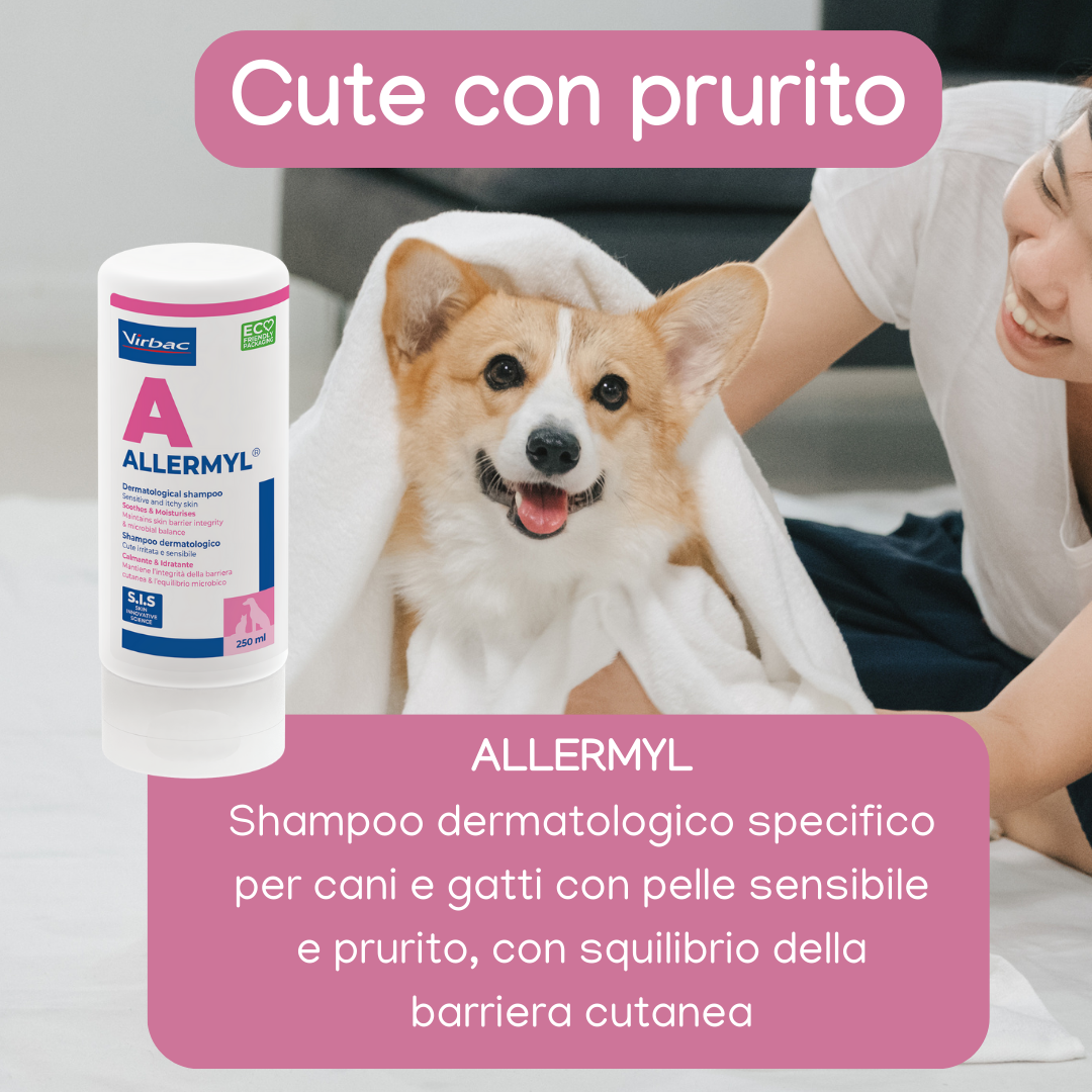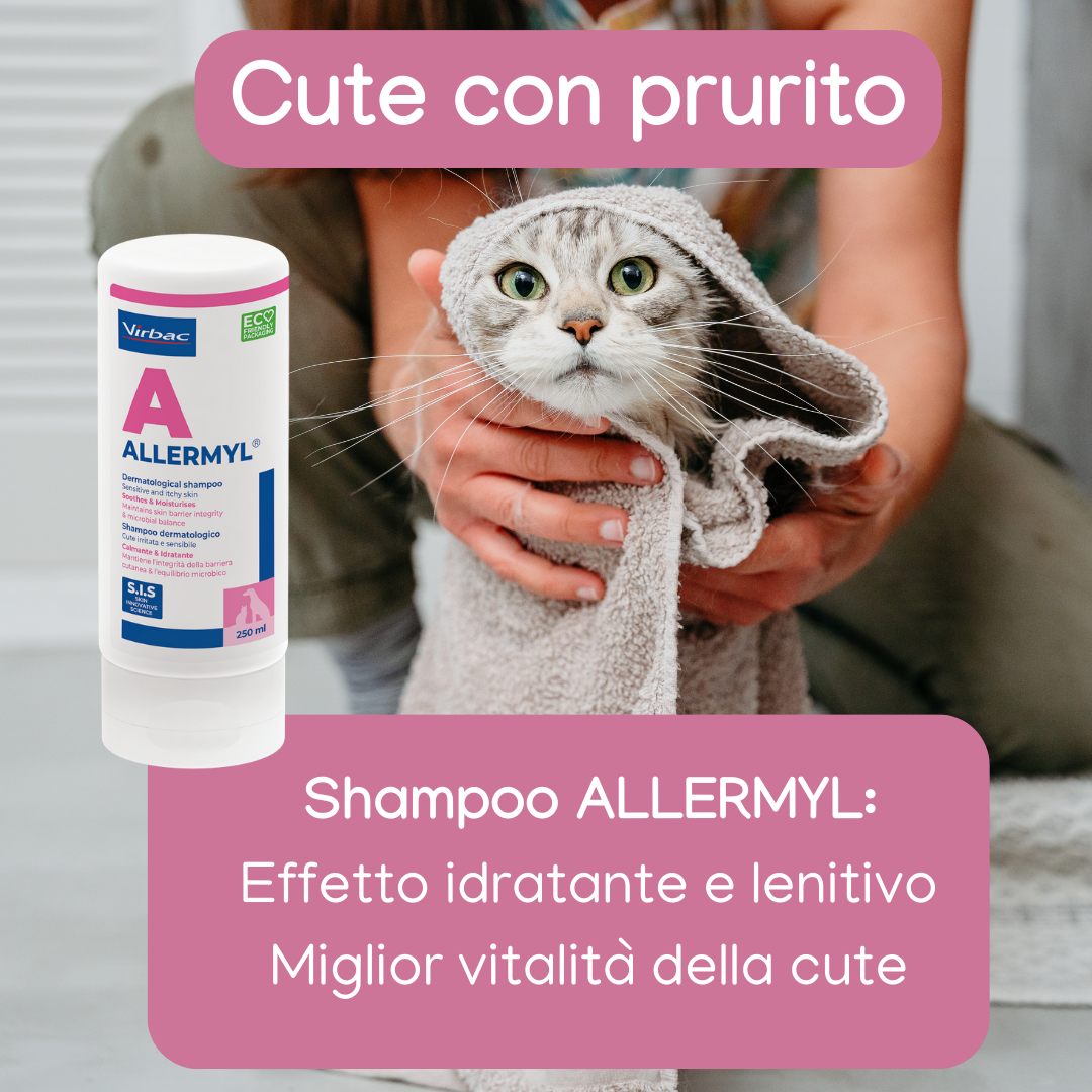 Allermyl è uno shampoo per cani e gatti con pelle sensibile, pruriginosa o a tendenza allergica. Aiuta a calmare i rossori e alleviare il prurito.