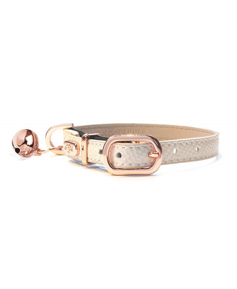 Katzenhalsband aus Kunstleder mit Eidechsenmuster, weichem beigefarbenem Innenfutter, Sicherheitsgummiband und Glöckchen; die Schnallen sind leicht und nickelfrei.