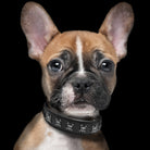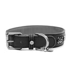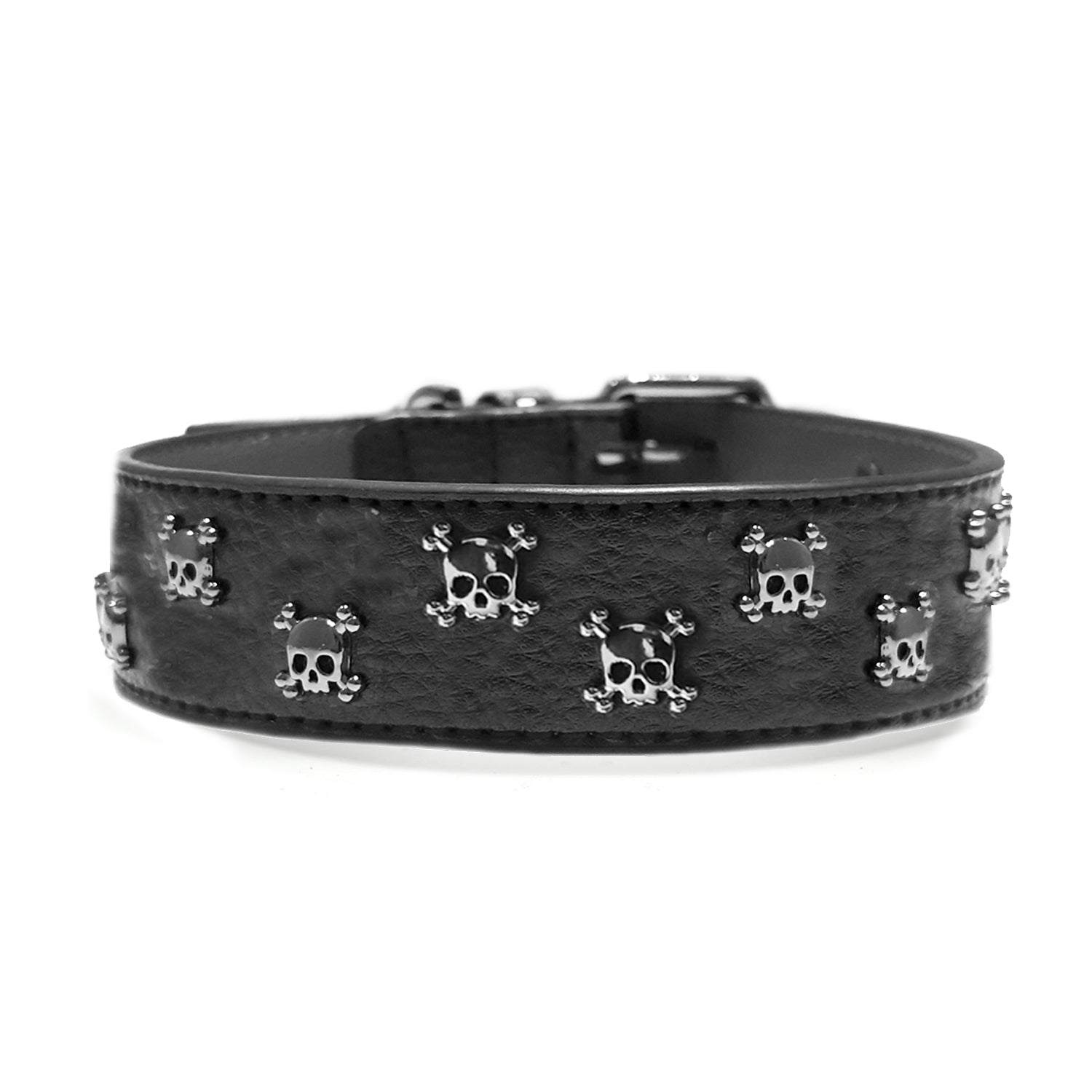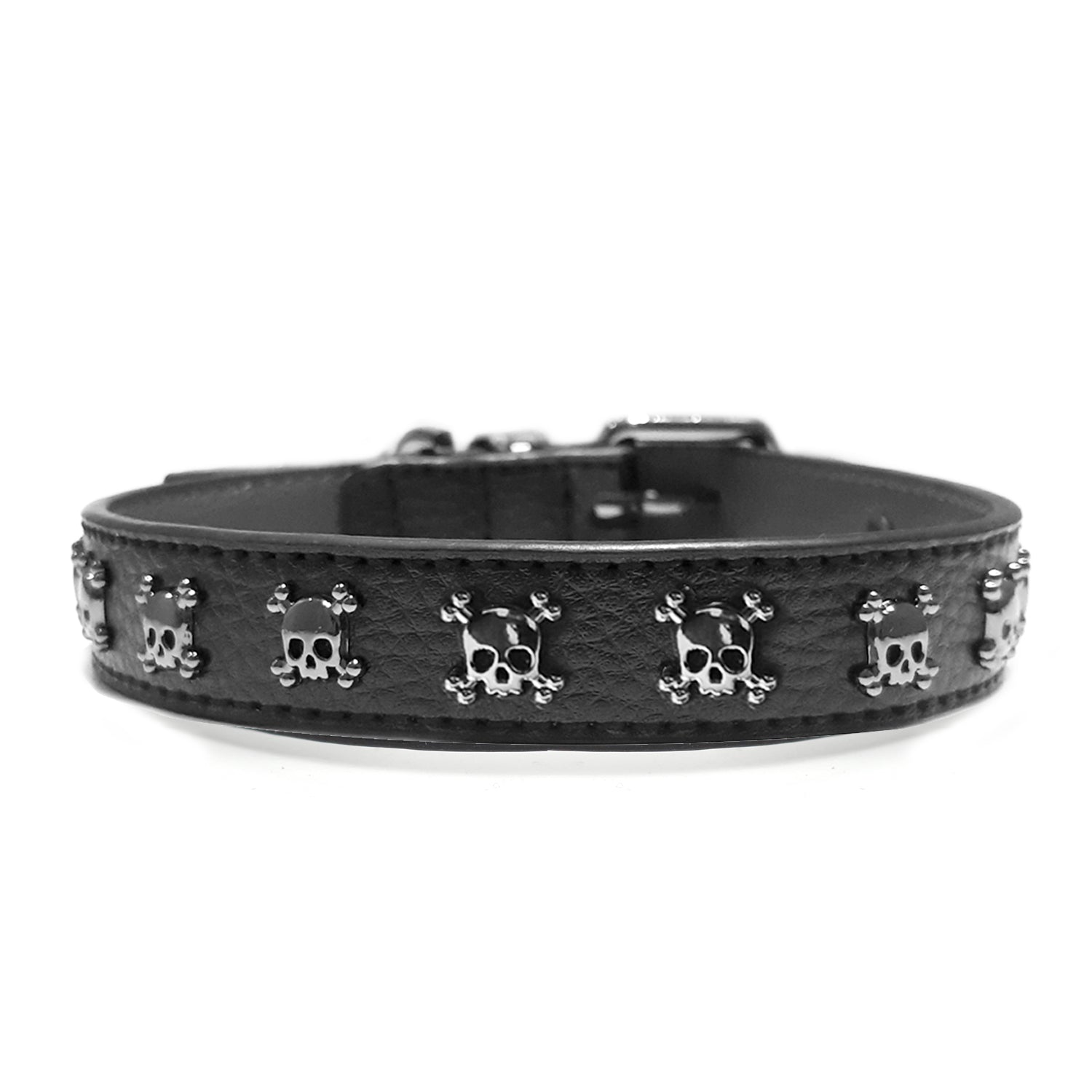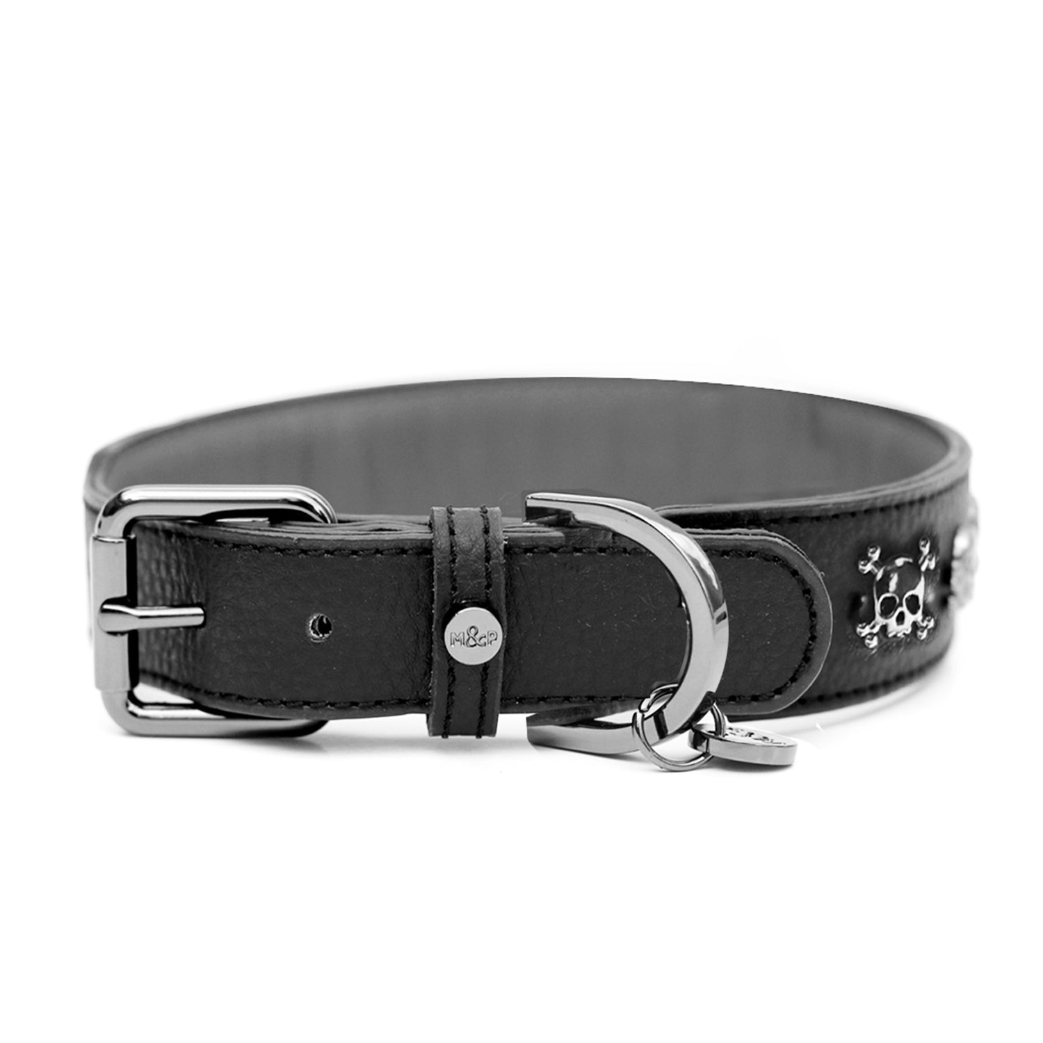 Das Halsband CALAVERA aus schwarzem genarbtem Leder ist perfekt für einen rockigen und mutigen Look. Mit Totenkopfnieten aus Titan verziert, ist es langlebig und einzigartig im Design. Das anthrazitgraue Innenfutter und die Ränder mit passender Emaille machen dieses Halsband noch origineller. Hergestellt aus titanfarbenen Metallprofilen, ist es ein Muss für Liebhaber alternativer Stile. Anthrazitgraues Innenfutter