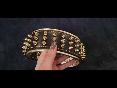 Das Halsband GOLD GIANT ist ein klassisches Modell mit einer Verzierung aus 12 mm langen, vergoldeten, messingfarbenen Schraubspitzen. Es besteht aus dickem Leder höchster Qualität und bietet Stärke und Haltbarkeit. Das weiche Innenkissen und das 100 % Lammfell sorgen für Komfort und höchste Qualität.