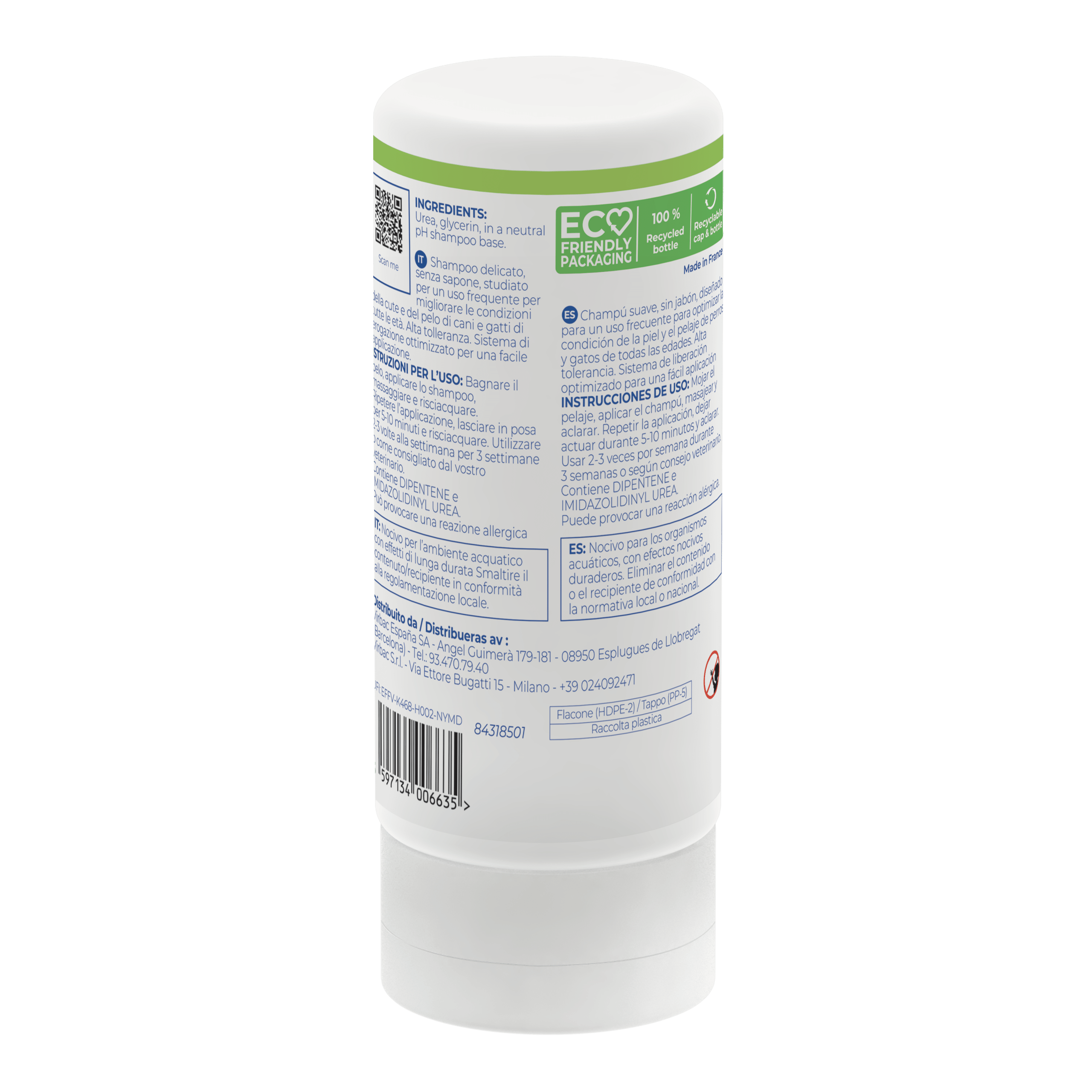 Ein sanftes, seifenfreies Shampoo für Hunde und Katzen mit trockener, schuppiger oder sich schälender Haut. Geeignet für Haustiere aller Größen, Rassen und Altersgruppen, einschließlich Welpen und Kätzchen.