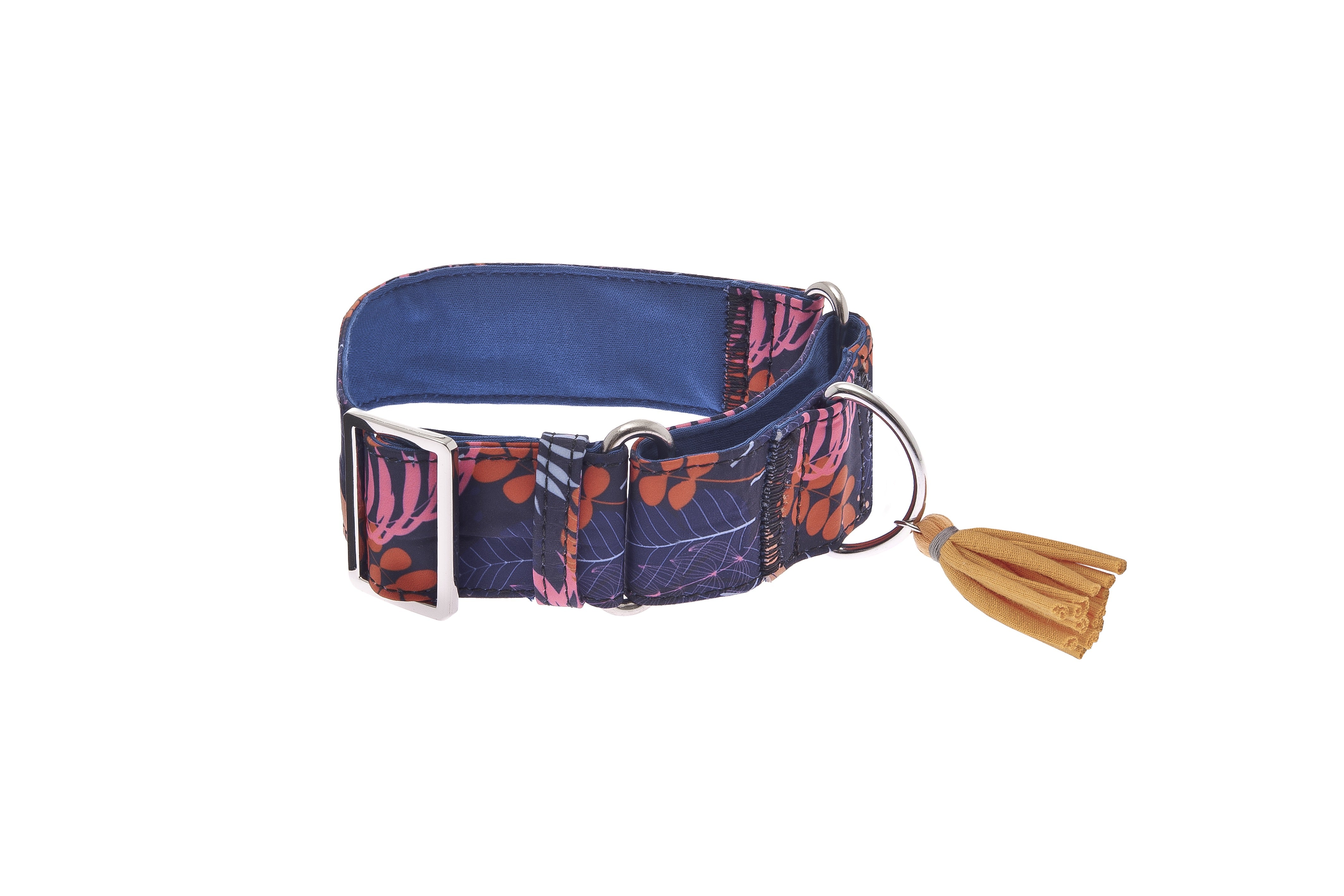 Adjustable Martingale Collar Kami Collection made of soft Cotton and Nylon, with a blue interior and floral exterior pattern, a collection inspired by the world of nature.