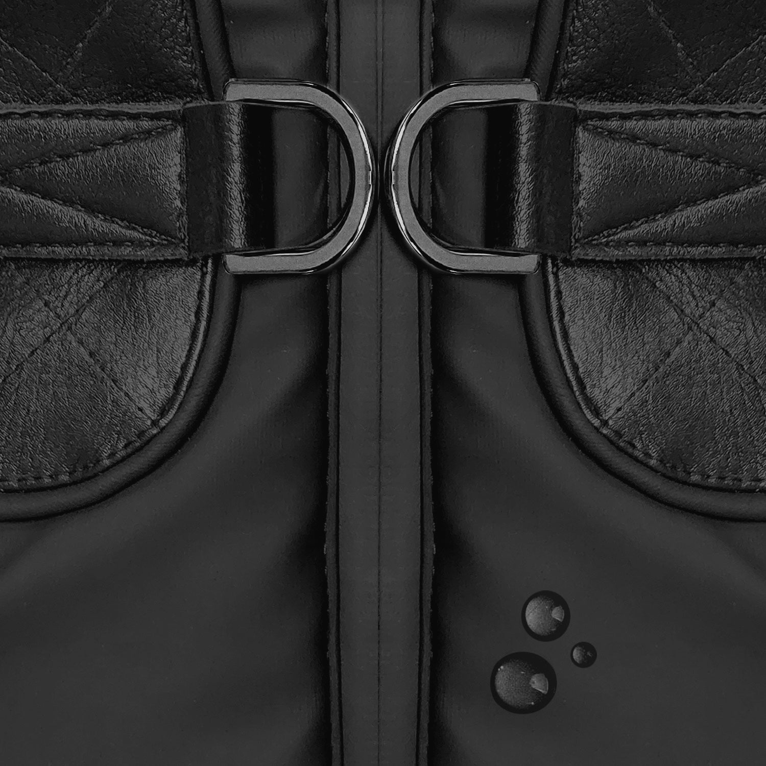 Black leather harness with titanium D-rings to hold the leash as a chest harness