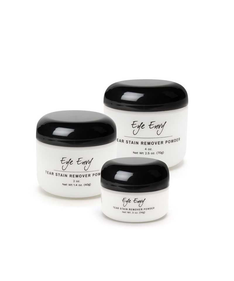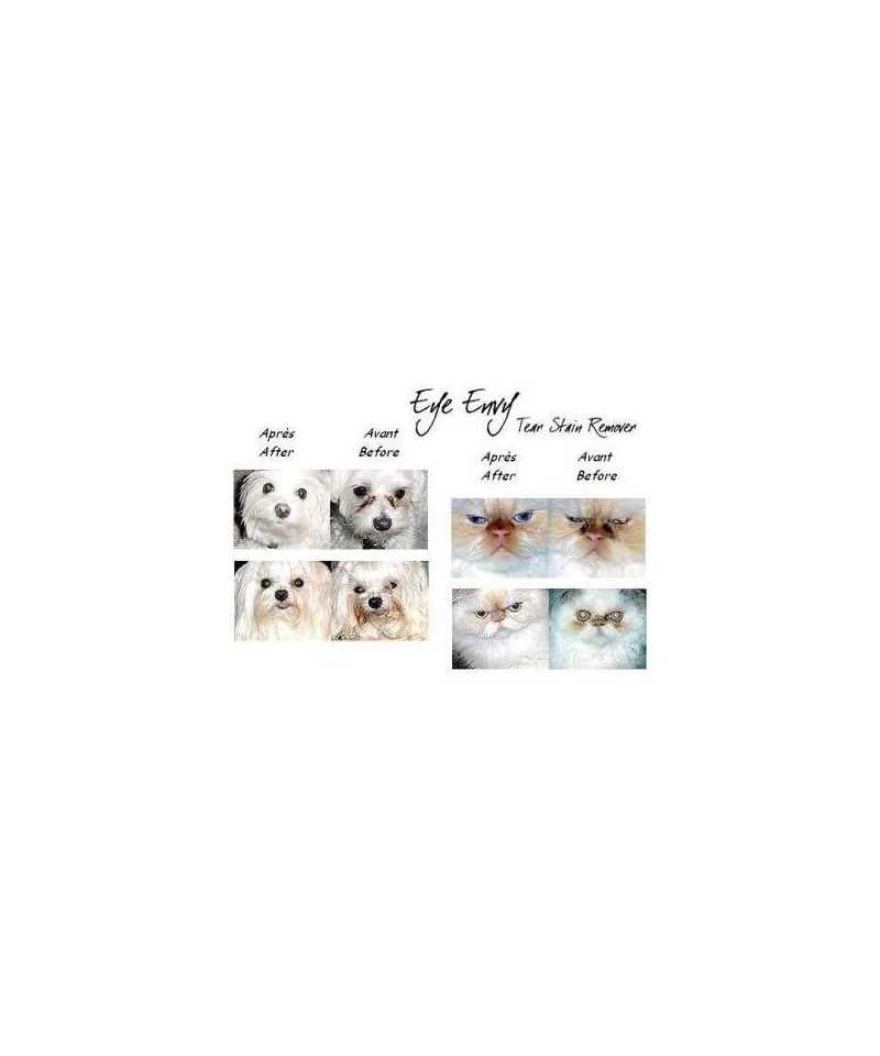 La polvere Eye Envy è un prodotto che rimuovere e previene le antiestetiche macchie scure sul pelo intorno agli occhi causate dall'eccessiva lacrimazione. Oltre alla rimozione ha un forte potere sbiancante e un' elevata capacità assorbente per le nuove lacrime. Prima di utilizzare la polvere è bene pulire il pelo con la soluzione occhi Eye Envy, che ha una potente azione sbiancante e disinfettante, e favorirà l'effetto sbiancante della polvere. Applicare esternamente sul pelo e contropelo del cane/gatto senza rimuoverla.